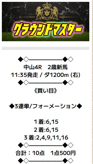 どの情報が的中確立高いか聞いてオススメされたので初回利用してみました。 買い目公開されたのは中山7R3歳以上1勝クラス。 普段、午前中や新馬戦、3勝クラス以下の条件戦は予想が難しいので避けていたので若干の初々しさを感じる競馬でした。